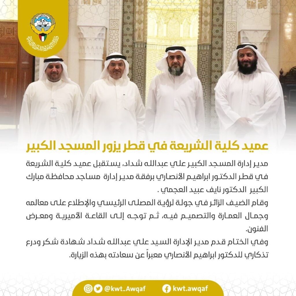 فضيلة العميد د.إبراهيم الأنصاري في زيارة لدولة الكويت الشقيقة بدعوة كريمة من وزارة الأوقاف والشؤون الاسلامية الكويتية، تتضمن لقاءات رسمية وعلمية مع عدد من الجهات والمؤسسات الكويتية